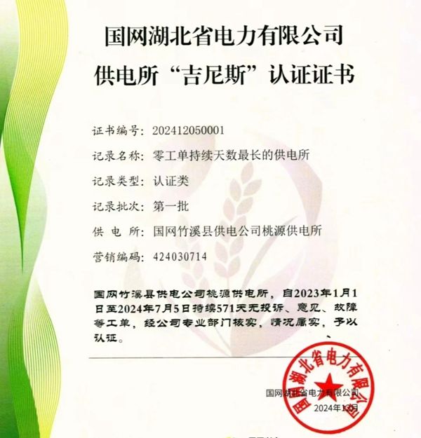 中國(guó)電力網(wǎng)訊(通訊員 黃耀成、郭旭) 日前,從國(guó)網(wǎng)湖北省電力有限公司傳來喜訊,繼去年國(guó)網(wǎng)竹溪縣供電公司匯灣供電所喜獲國(guó)網(wǎng)十堰供電公司“四星級(jí)鄉(xiāng)鎮(zhèn)供電所”授牌后,今年國(guó)網(wǎng)竹溪縣供電公司桃源供電所又獲國(guó)網(wǎng)湖北省電力有限公司頒發(fā)的零工單位持續(xù)天數(shù)最長(zhǎng)的供電所“吉尼斯”認(rèn)證證書,這是該公司強(qiáng)化從業(yè)紀(jì)律,擦亮服務(wù)窗口,電業(yè)清風(fēng)為民的真實(shí)寫照。