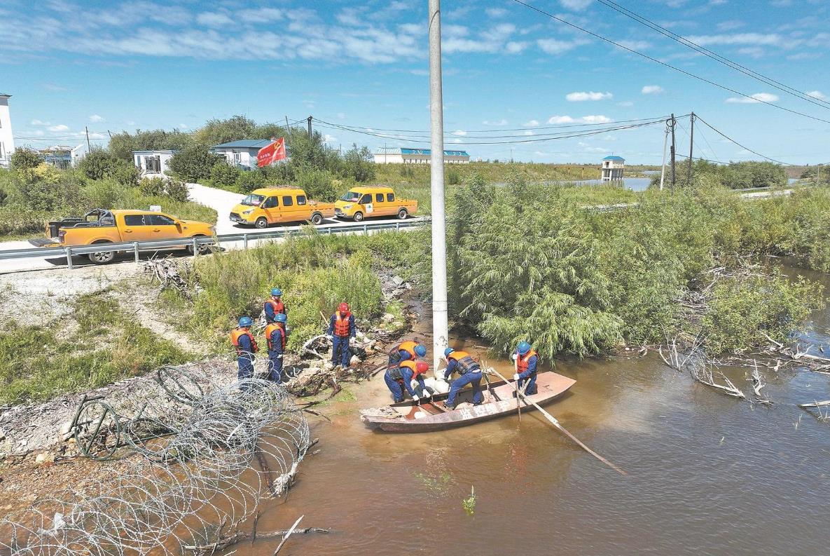 8月14日,黑龍江佳木斯供電公司員工在烏蘇鎮(zhèn)加固10千伏廣場(chǎng)線131號(hào)電桿基礎(chǔ),保障線路安全運(yùn)行。吳迪 攝