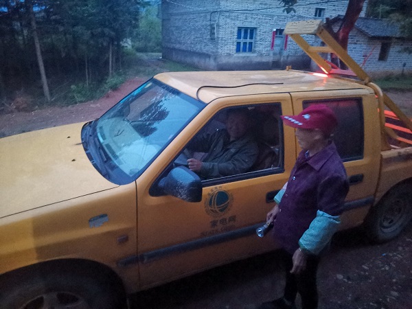 “太好了,你們來(lái)了,這下晚上可以不用摸黑了……”18時(shí)55分,經(jīng)過(guò)25分鐘的車程,陳文清班長(zhǎng)和班員到達(dá)陳家蕪頭村,陳德文和老伴正打 著手電筒,看到供電搶修車的到來(lái),很是激動(dòng)。