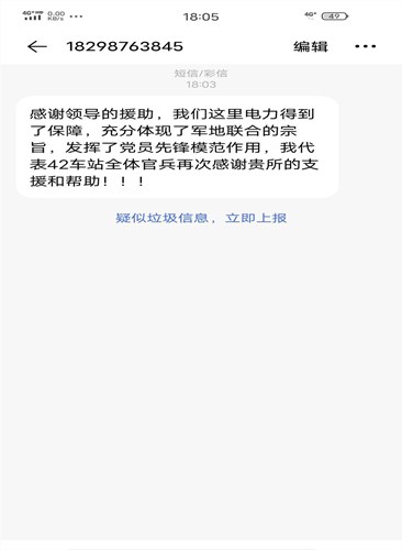 中國(guó)電力網(wǎng)訊 “感謝貴所的援助,我們這里電力得到了保障,充分體現(xiàn)了軍地聯(lián)合的宗旨,發(fā)揮了黨員先鋒模范作用,我代表42號(hào)車(chē)站全體官兵再次感謝貴所的支援和幫助!”這是一份來(lái)自國(guó)網(wǎng)甘肅肅南縣供電公司蓮花供電所管轄范圍內(nèi)的解放軍42號(hào)車(chē)站站長(zhǎng)發(fā)來(lái)的感謝短信,這份不尋常的感謝短信里表達(dá)著他們對(duì)該公司搶修人員快速解決部隊(duì)用電故障的感激之情。