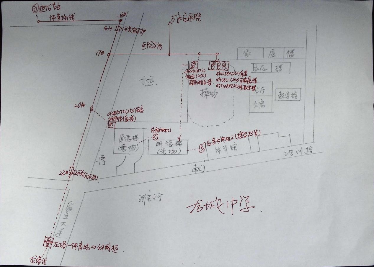 諸城市龍城中學建校于1998年,隨著學校的發(fā)展,校園規(guī)模逐步擴大,供電變壓器也越來越多,且較為分散。該用戶現(xiàn)有配變5臺、總?cè)萘?200千伏安,電源全部來自110千伏迪龍站10千伏體育場線。對此,該校用電出現(xiàn)了電源點單一、供電可靠性相對不高,配變數(shù)量多且分散的特殊情況。為了熟練掌握龍城中學供電基本情況,確保高考保供電萬無一失,該公司舜王供電所工作人員多次現(xiàn)場勘查,手工繪制了該校區(qū)的供電網(wǎng)絡平面圖。該圖簡要繪制了龍城中學的建筑平面布置圖,標明了考場等重要負荷位置;涵蓋了龍城中學高壓電源走向圖、線路結構和標明T接點位置;明確了用戶5臺配變的分布位置和供電區(qū)域;綜合考慮接入線路和噪音影響,明確了供電公司保供電應急發(fā)電機的安裝和接入位置等。