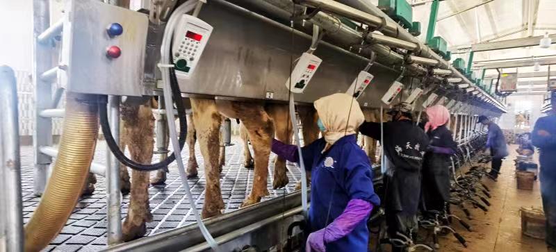 擠奶車間里,黑白相間的奶牛列隊(duì)走上緩緩轉(zhuǎn)動(dòng)的擠奶轉(zhuǎn)臺(tái),工人們依次對(duì)它們進(jìn)行采奶前的乳頭清洗消毒工作,隨后,德國原裝進(jìn)口轉(zhuǎn)盤擠奶機(jī)對(duì)奶牛進(jìn)行自動(dòng)擠奶。看著一股股潔白的乳汁流進(jìn)容器,場(chǎng)長郭宏勝露出喜悅的笑容。