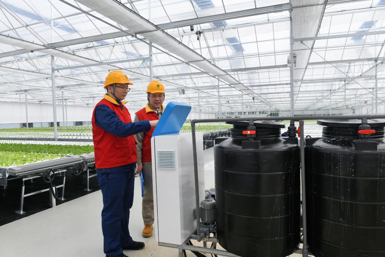 田野上的作物剛開始生長,各種現(xiàn)代化大棚里的蔬菜已經(jīng)煥發(fā)了盎然的生機(jī)。在橫坎頭村的蔚藍(lán)智谷植物工廠里,綠油油的菠菜、生菜、小松菜等蔬菜種在整齊的培養(yǎng)基上,一個個高大的溫室大棚連在一起,猶如工廠的車間,工作人員通過智能系統(tǒng)控制著溫度、濕度和營養(yǎng)液輸送。這樣的農(nóng)業(yè)種植模式打破了傳統(tǒng)的種植概念,將蔬菜種植“工廠化”,品質(zhì)和市場都得到了良好的保障。