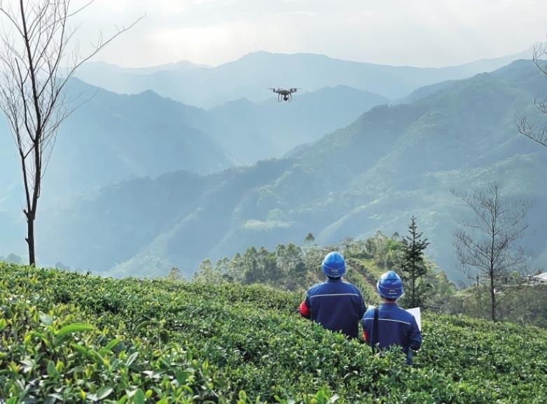 清遠清新供電局石潭供電所員工用無人機對茶園供電線路進行特巡。 劉家健 攝