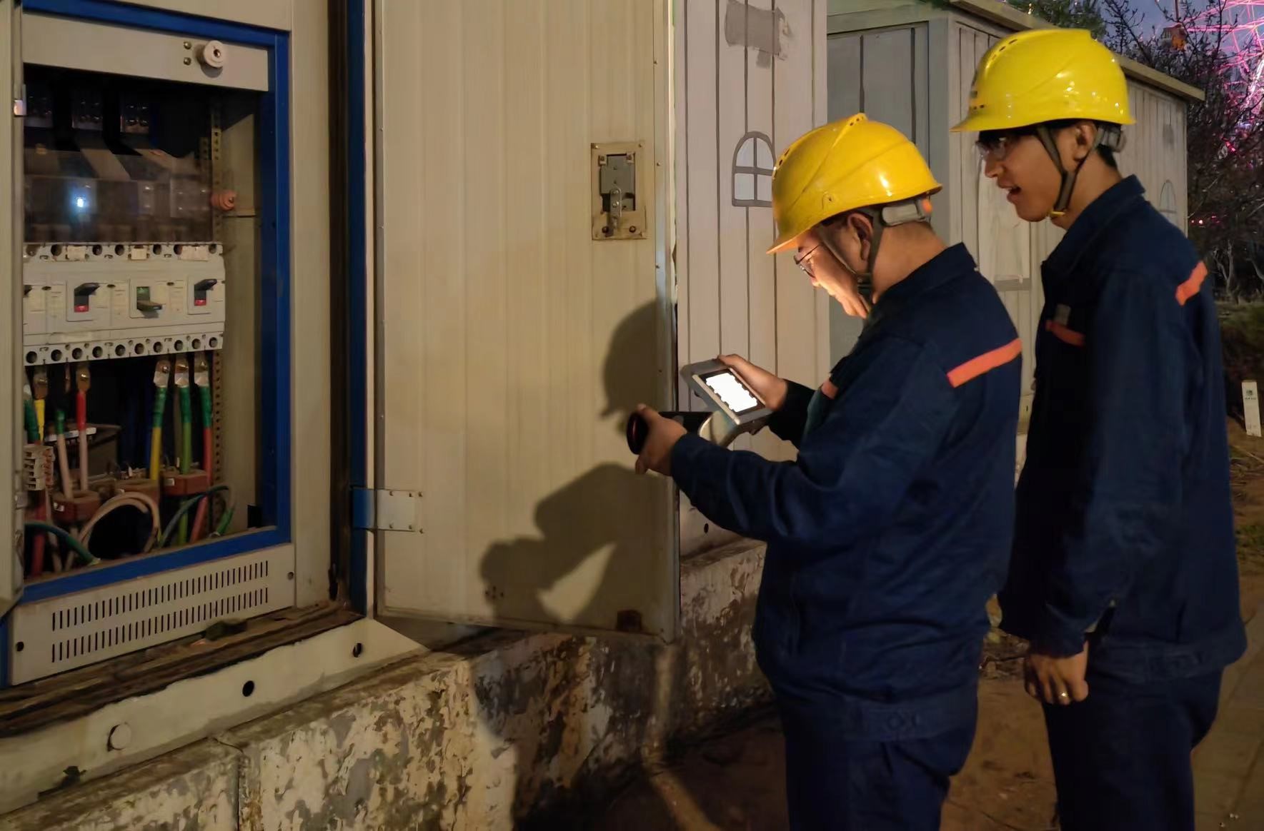 6月24日20時,熙熙攘攘的人群里,郭智遠和袁小龍穿行其中。今晚,他倆要完成蒙欣廣場和德榮2個夜市的用電安全檢查。“迎峰度夏期間工作量大,全憑兩條腿,必須要到現(xiàn)場實際檢查才能放心。”他們利用紅外測溫儀通過電暈、局部放電、溫升燒紅等現(xiàn)象來發(fā)現(xiàn)導(dǎo)線連接器及絕緣子存在的缺陷。對蒙欣廣場夜市、德榮夜市線路刀閘閘口、接頭、導(dǎo)線線夾等易發(fā)熱部位進行全方位檢查,及時掌握設(shè)備運行狀態(tài),避免設(shè)備出現(xiàn)故障。結(jié)束了夜市的用電安全檢查,收拾好工器具,已是22:20,但汗流浹背的兩個人并沒有回程,他們還要前往體育館的10千伏線路開展夜巡工作。