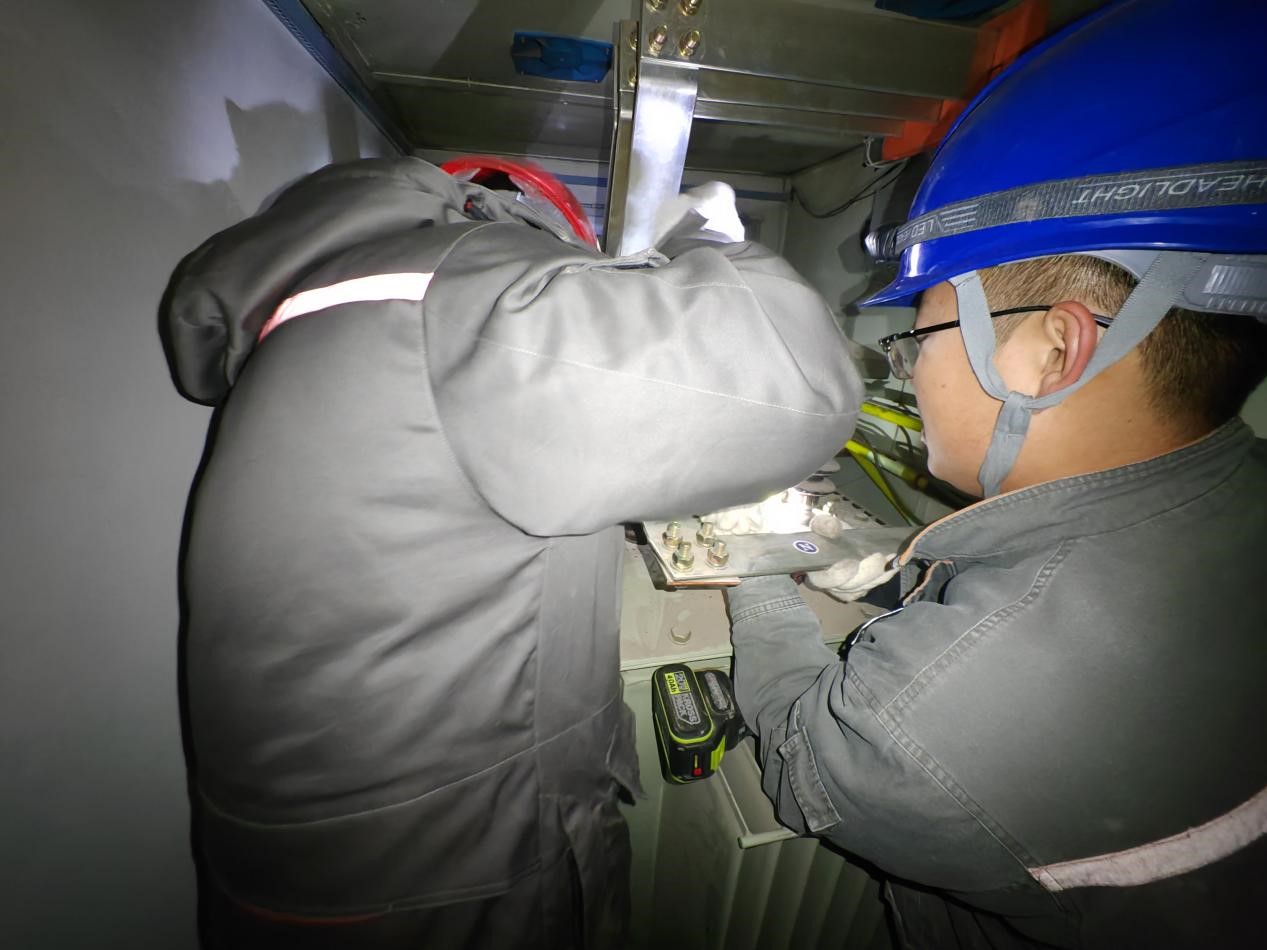 接到任務后,“電靚暖城”共產(chǎn)黨員服務隊第一時間趕往現(xiàn)場,經(jīng)過現(xiàn)場勘查發(fā)現(xiàn),由于大雪極寒天氣,居民取暖用電量急速攀升,導致負荷不均勻,小區(qū)箱變低壓母排燒損導致停電。由于夜間光線不足,給搶修工作增加了難度??蛋褪补╇姽旧a(chǎn)技術室迅速確認搶修方案,組織人員有序投入到搶修工作中,同時在供電服務群中向客戶實時反饋搶修進度和現(xiàn)場工作照片,得到了廣大群眾的理解和支持,消除了群眾對突發(fā)停電存在的疑慮。“天寒地凍家里突然停電,感覺心里都是涼的,看到你們過來,心里就像吃了定心丸,看到了希望。”神華小區(qū)87號樓業(yè)主說。