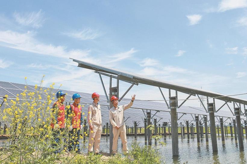 2024年4月25日,黨員服務隊隊員和肥東縣晶斗光伏電站員工共同巡檢發(fā)電設備。陳海東 攝