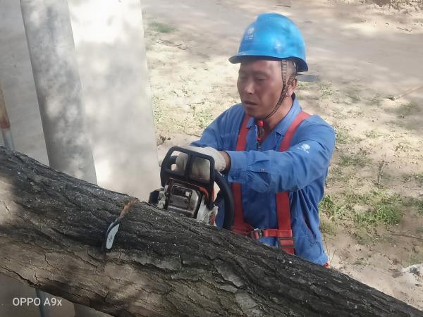 在現場,工作電鋸的呲呲聲、斧頭的敲打聲、腳扣攀登電桿的噠噠聲......每位工作人員全然顧不上天氣的悶熱,井然有序的全身心投入,“高空”開展伐樹、修剪作業(yè),不一會汗水就濕透了衣背。