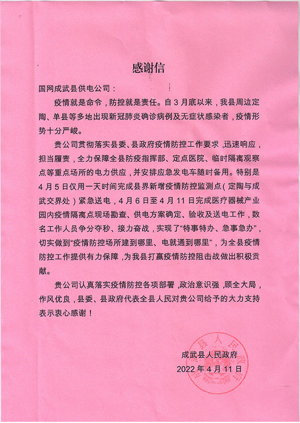 感謝信中說,自3月底以來,疫情形勢十分嚴峻,成武公司貫徹落實縣委、縣政府疫情防控工作要求,迅速響應擔當履責。工作人員爭分奪秒、接力奮戰(zhàn),實現(xiàn)了“特事特辦、急事急辦”切實做到“疫情防控場所建到哪里、電就通到哪里",全力保障全縣防疫指揮部、定點醫(yī)院、臨時隔離觀察點等重點場所的電力供應,并安排應急發(fā)電車隨時備用,體現(xiàn)了政治意識強,顧全大局的優(yōu)良作風。
