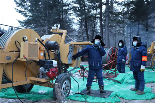 牽引機、電纜軸快速轉(zhuǎn)動,粗實的導(dǎo)線順著前方的鐵塔上的滑輪緩緩回收,導(dǎo)地線展放、張力緊線、附件安裝、導(dǎo)線壓接……冬季的寒風刺骨,施工人員顧不上寒冷,加緊施工。