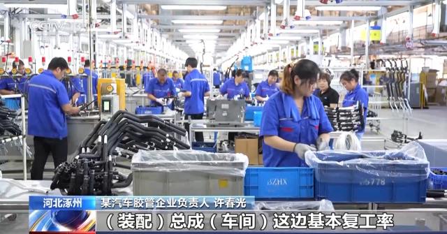 某汽車膠管企業(yè)負責人 許春光:膠管擠出線11條復(fù)工了4條,裝配總成車間這邊基本復(fù)工率大概在70%—80%之間,我估計裝配總成車間還有不到一個星期差不多就恢復(fù)正常了。