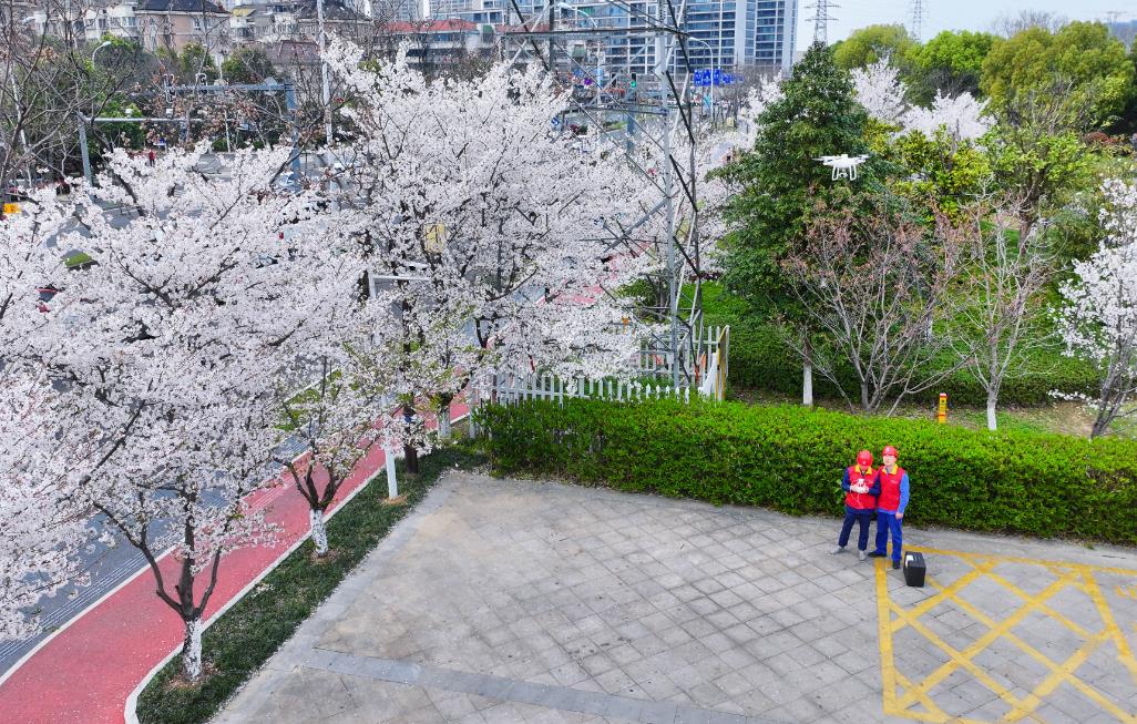 在公園西側(cè)一排櫻花樹下,黨員服務隊隊員嚴奇敏熟練地組裝起無人機,對附近的線路開展巡視。“10千伏三官C423線、孤山C411線無塑料薄膜、風箏等掛線情況,線路運行良好,繼續(xù)巡視下一段。”