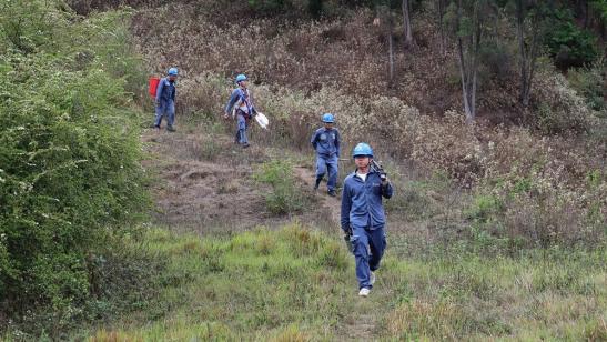 南方電網(wǎng)輸電運(yùn)維人員走在山路上,前往山嶺上對(duì)輸電線(xiàn)路開(kāi)展特巡特維。