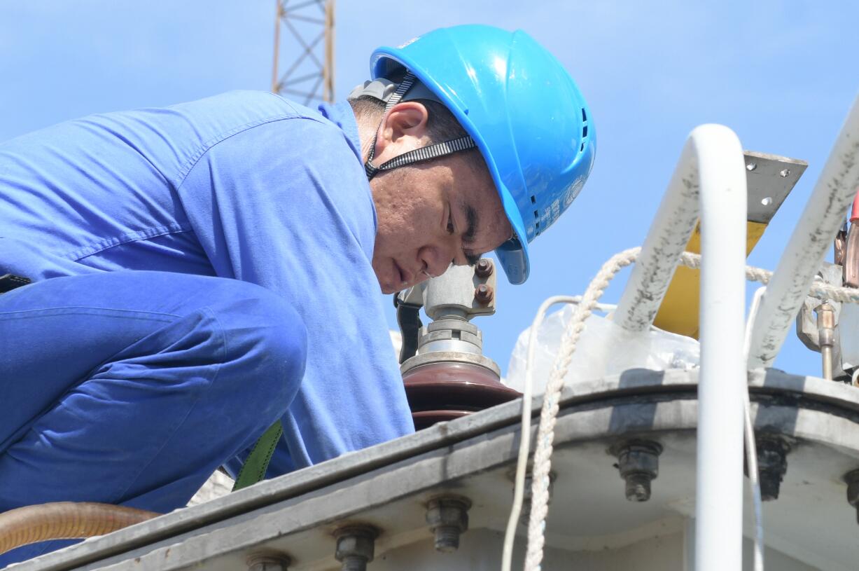 刺眼的烈日給檢修工作帶來不少影響,此時(shí)主變上的溫度已近50度,檢修人員們克服高溫穩(wěn)步推進(jìn)各項(xiàng)工作,不一會(huì)兒曬紅的臉頰也掛滿了汗水,衣服也被浸濕。隨著檢修人員將分接開關(guān)裝復(fù)、充油,完成主變?cè)\斷性試驗(yàn),至20點(diǎn)37分,全部工作順利完成。