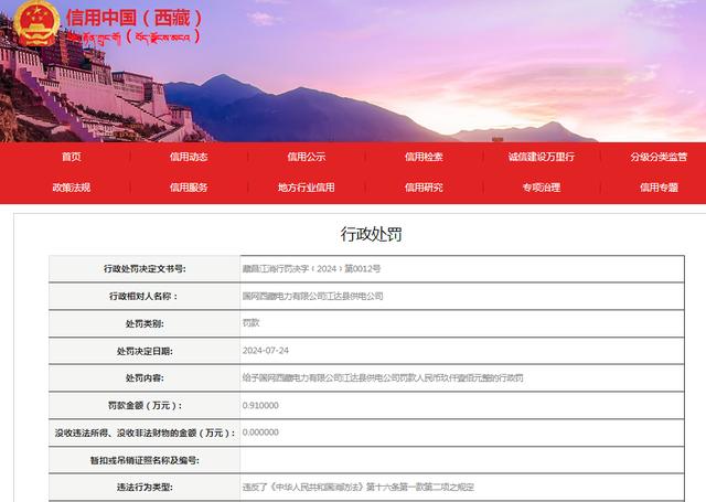 近日國網(wǎng)西藏電力有限公司江達縣供電公司因營業(yè)大廳內未設置疏散指示標志,被江達縣消防救援大隊給予罰款人民幣9100元整的行政處罰。