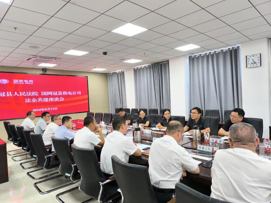 為進(jìn)一步優(yōu)化法治營(yíng)商環(huán)境,滿(mǎn)足企業(yè)日益增長(zhǎng)的司法需求,8月13日,冠縣法院與國(guó)網(wǎng)冠縣供電公司召開(kāi)法企共建座談會(huì)。國(guó)網(wǎng)冠縣供電公司黨組書(shū)記常增軍、冠縣法院刑庭庭長(zhǎng)程敏、民二庭負(fù)責(zé)人李彥華及相關(guān)人員參加座談。