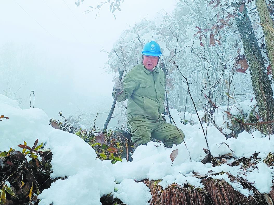 國網(wǎng)鄖西縣供電公司員工借助樹木拐杖巡視易覆冰區(qū)段線路。
