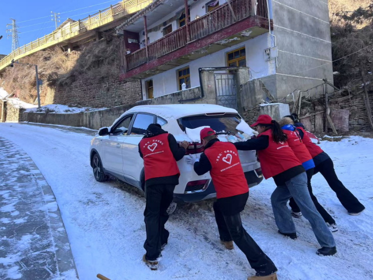當(dāng)天早上,在德吉巷路,10余名身穿紅馬甲的“羊角花”志愿者分工協(xié)作、互相配合,有的負責(zé)鏟除厚重的積雪,有的專注清掃路面,確保不留死角。遇到結(jié)冰的地方,志愿者們更是齊心協(xié)力,用鐵鍬一點點破冰,再將碎冰和積雪清理干凈。在除雪過程中,一輛汽車爬坡行駛受路面冰雪影響,車輪不斷打滑,無法前進。附近的志愿者們見狀,立刻放下手中工具,迅速趕來幫忙。他們分成兩組,一組在車后用力推動,一組在車前指揮方向,齊聲喊著口號,齊心協(xié)力助力車主解決困難。經(jīng)過近兩小時的共同努力下,道路及兩旁的人行道清理出安全路線,方便群眾出行。