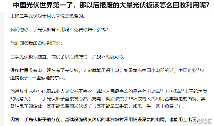 知乎有這么一個問題“中國光伏世界第一了,那以后報廢的大量光伏板該怎么回收利用呢?”,上圖是其中的一個回答。至少,中國的新能源已經(jīng)開始改變非洲了。