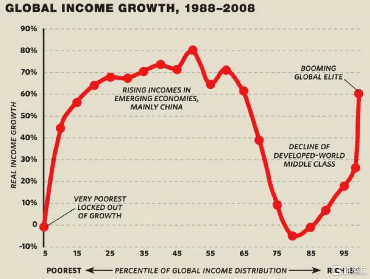 這就是那條著名的“大象曲線”,反映了全球收入的不平等狀況。從1988年到2008這20年間,收入增長最快的有兩部分人,一部分是發(fā)達國家那1%的全球化精英,另一部分是發(fā)展中國家的中產(chǎn)階級,尤其是中國。有贏就有輸,相對的輸家就是發(fā)達國家的中產(chǎn)階級和中下層階級。