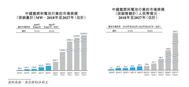 而中國氫燃料電池行業(yè)的市場規(guī)模也已由2018年的人民幣7億元增至2022年的29億元,復(fù)合年增長率為41.8%。預(yù)計將于2027年達(dá)到人民幣293億元。