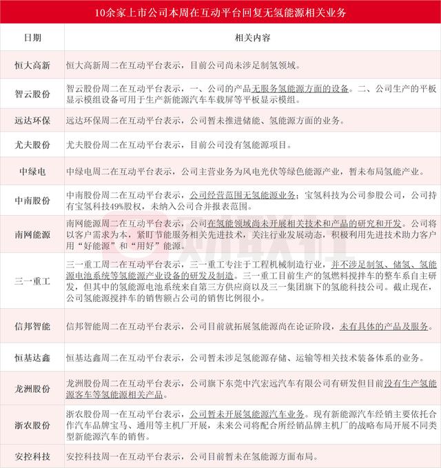 據(jù)財(cái)聯(lián)社不完全統(tǒng)計(jì),恒大高新、智云股份、遠(yuǎn)達(dá)環(huán)保、尤夫股份、中綠電、中南股份、南網(wǎng)能源、三一重工、信邦智能、恒基達(dá)鑫、龍洲股份、浙農(nóng)股份和安控科技在內(nèi)的13家上市公司本周在互動(dòng)平臺(tái)無(wú)氫能源相關(guān)業(yè)務(wù)。具體情況如下圖: