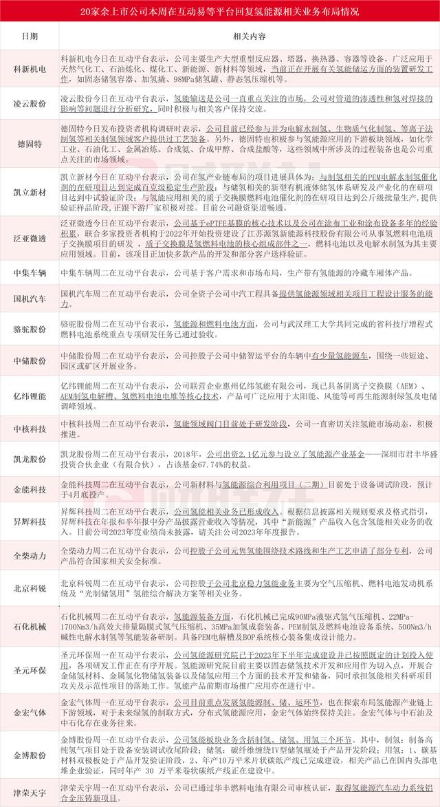 據(jù)財(cái)聯(lián)社不完全統(tǒng)計(jì),科新機(jī)電、凌云股份、德固特、凱立新材、泛亞微透、中集車輛、國(guó)機(jī)汽車、駱駝股份、中儲(chǔ)股份、億緯鋰能、中核科技、凱龍股份、金能科技、昇輝科技、全柴動(dòng)力、北京科銳、石化機(jī)械、圣元環(huán)保、金宏氣體、金博股份和津榮天宇在內(nèi)的21家上市公司本周在互動(dòng)易等平臺(tái)回復(fù)氫能源相關(guān)業(yè)務(wù)情況。其中,德固特今日發(fā)布投資者機(jī)構(gòu)調(diào)研時(shí)表示,公司目前已經(jīng)參與并為制氫領(lǐng)域客戶提供過(guò)工藝裝備。凱立新材今日在互動(dòng)平臺(tái)表示,公司在氫產(chǎn)業(yè)鏈布局的項(xiàng)目進(jìn)展具體為:與制氫相關(guān)的PEM電解水制氫催化劑的在研項(xiàng)目達(dá)到完成百克級(jí)穩(wěn)定生產(chǎn)階段。具體情況如下圖: