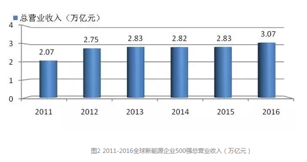 2016年“500強”企業(yè)的總營業(yè)收入邁上一個新臺階,達到30666億元人民幣,首次突破3萬億元人民幣,比2015年的28329億元增加了2337億元人民幣。圖2給出了2011年至2016年全球新能源企業(yè)500強歷年的總營業(yè)收入情況。