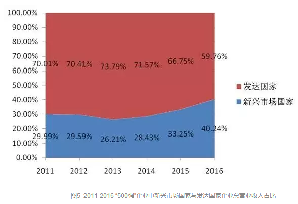 圖5則給出了2011-2016 “500強”企業(yè)中新興市場國家與發(fā)達國家企業(yè)總營業(yè)收入占比情況。此圖更直觀的印證了上述趨勢。