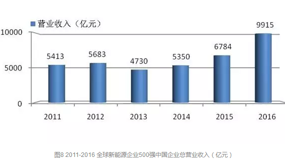圖8給出了2011-2016年全球新能源企業(yè)500強中國企業(yè)總營業(yè)收入的變化情況,由圖中可以看出,隨著中國在新能源產(chǎn)業(yè)投資的增加,特別是光伏電站裝機容量大幅增加,“500強”中中國企業(yè)的營業(yè)收入增加也跟著增加,特別是這兩年這一趨勢更加明顯,這也凸顯了中國企業(yè)的競爭力在增強。