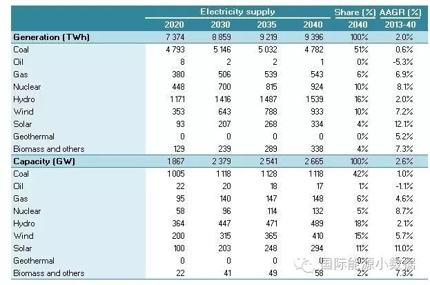 2040 年一次能源供應(yīng)達到46.95億噸標(biāo)油,其中煤炭占51%、石油16%、天然氣13%、核電5%、水電3%、非水可再生能源12%。從發(fā)電量來看,2040年總裝機達3145吉瓦,發(fā)電量達11.78萬億千瓦時,煤電占56%、天然氣發(fā)電9%、核電8%、水電13%、風(fēng)電8%、光伏3%、生物質(zhì) 3%。