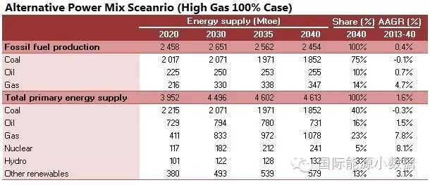 在大力推廣天然氣發(fā)電的情境下,2040年一次能源供應(yīng)為46.13億噸標(biāo)油,其中煤炭跌至40%、石油16%、天然氣高達23%、核電5%、水電3%、非水可再生能源13%。從發(fā)電量來看,2040年總裝機達3146吉瓦,發(fā)電量達11.78萬億千瓦時,煤電占36%、天然氣發(fā)電30%、核電8%、水電 13%、風(fēng)電8%、光伏3%、生物質(zhì)3%。