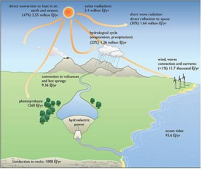 太陽(yáng)直接照射在空氣、地表和海洋吸收47%(2.55百萬(wàn)EJ/年)熱量