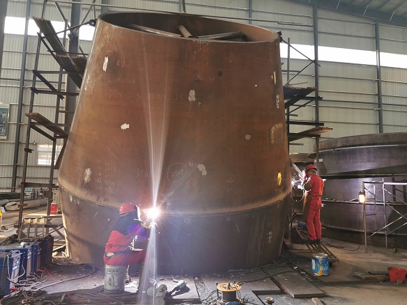 河南天池抽水蓄能電站鋼岔管為加強(qiáng)月牙肋型式,岔管主管直徑為4500mm,支管直徑為3100mm,分叉角為70度,擴(kuò)大率為115%。制造過程中岔管管殼全部為Q690E高強(qiáng)度鋼,月牙肋材質(zhì)為Q690EZ35。鋼岔管體積大,悶頭焊接過程為全封閉焊接,焊接技術(shù)要求高且難度大。