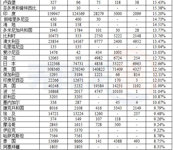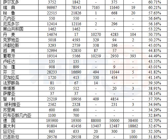 表2列出了154個國家的再生能源發(fā)電量,并有占發(fā)電總量的百分率;而且有再生能源發(fā)電總量的構(gòu)成。數(shù)據(jù)取自2012~2015年各國的數(shù)據(jù),當然數(shù)據(jù)會不斷更新,但只會更好。由于地熱發(fā)電量小,未列入表中。