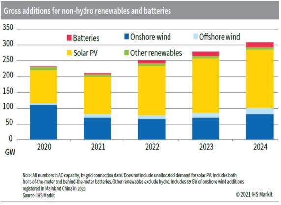 根據(jù)國際市場研究機(jī)構(gòu)IHS Markit的白皮書,全球每年可再生能源發(fā)電容量增量將從2020年的200吉瓦增加到2022年的約250吉瓦,然后到2024年增加到300吉瓦以上。