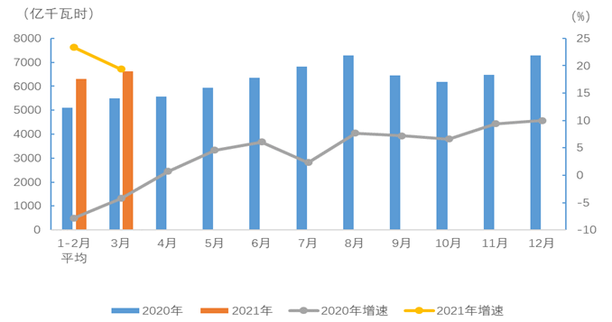 1-3月,全國全社會用電量19219億千瓦時,同比增長21.2%,其中,3月份全國全社會用電量6631億千瓦時,同比增長19.4%。