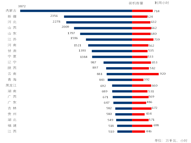 圖3 1-3月份風(fēng)電裝機(jī)較多省份風(fēng)電裝機(jī)容量和設(shè)備利用小時(shí)