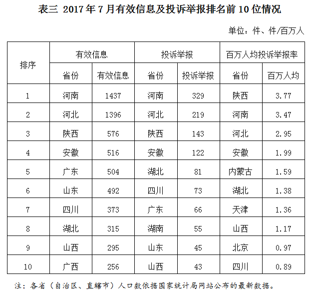 各?。ㄗ灾螀^(qū)、直轄市)按照收到的有效信息數(shù)量排序,河南、河北、陜西、安徽、廣東等省列全國(guó)前10位;按照投訴舉報(bào)數(shù)量排序,河南、河北、陜西、安徽、湖北等省排在全國(guó)前10位。按照百萬(wàn)人均投訴舉報(bào)率排序,陜西、河南、河北、安徽、內(nèi)蒙古等省位于全國(guó)前10位。(2017年7月有效信息及投訴舉報(bào)排名前10位情況見表三)