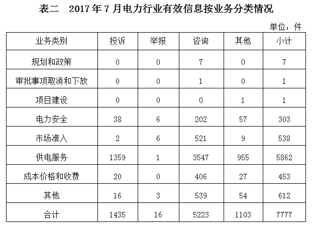 2017年7月收到的有效信息中,電力行業(yè)類7777件,占88.26%;新能源和可再生能源行業(yè)類494件,占5.61%;石油天然氣行業(yè)類20件,占0.23%;煤炭行業(yè)類2件,占0.02%;其他事項(xiàng)518件,占5.88%。