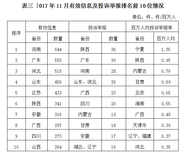 2017年11月,各省(自治區(qū)、直轄市)按照有效信息數(shù)量排序,河南、廣東、河北等省列全國(guó)前10位;按照投訴舉報(bào)數(shù)量排序,陜西、廣東、河南等省排在全國(guó)前10位;按照百萬(wàn)人均投訴舉報(bào)率排序,寧夏,陜西,內(nèi)蒙古等省位于全國(guó)前10位。(2017年11月有效信息及投訴舉報(bào)排名前10位情況見(jiàn)表三)