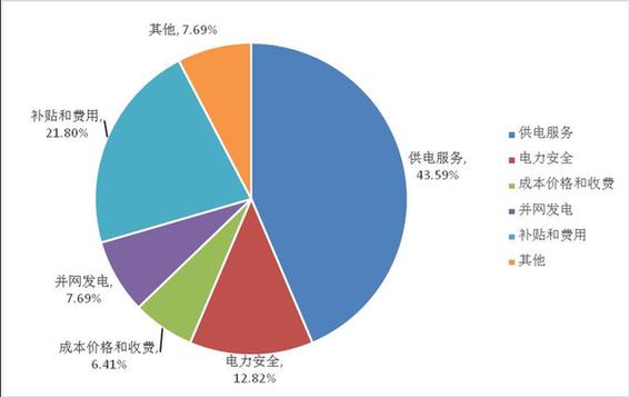 按業(yè)務(wù)類別分類:供電服務(wù)類34件,占43.59%;電力安全類10件,占12.82%;成本價格和收費類5件,占6.41%;并網(wǎng)發(fā)電類6件,占7.69%;補貼和費用類17件,占21.80%;其他類6件,占7.69%。