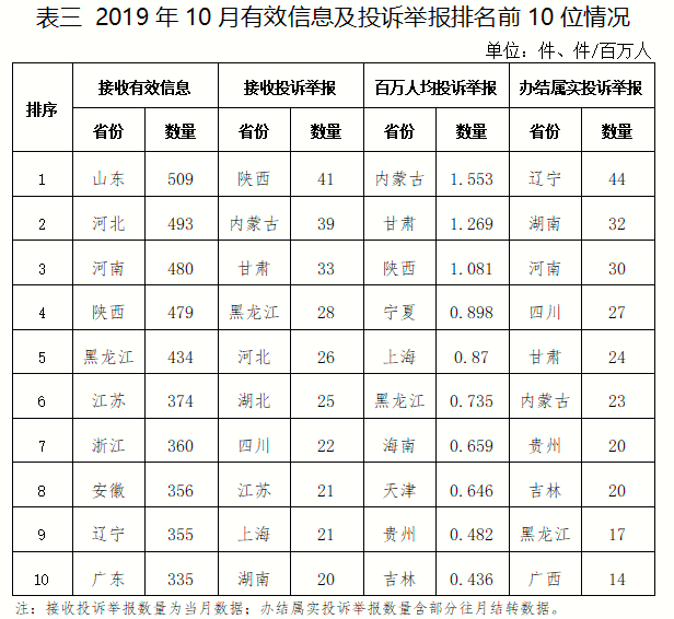各省(自治區(qū)、直轄市)按照收到的有效信息數(shù)量排序,山東、河北、河南、陜西、黑龍江等列全國前10位;按照投訴舉報數(shù)量排序,陜西、內(nèi)蒙古、甘肅、黑龍江、河北等排在全國前10位;按照百萬人均投訴舉報數(shù)量排序,內(nèi)蒙古、甘肅、陜西、寧夏、上海等排在全國前10位;按照辦結屬實投訴舉報數(shù)量排序,遼寧、湖南、河南、四川、甘肅等排在全國前10位。(2019年10月有效信息及投訴舉報排名前10位情況見表三)