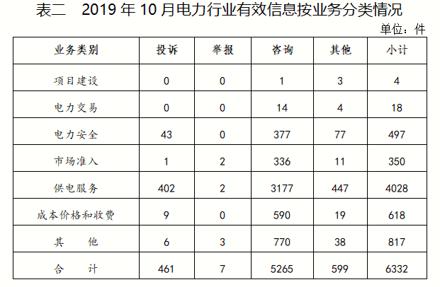 電力行業(yè)排在首位,有效信息數(shù)量為6332件,占全部有效信息的78.64%;其中受理的投訴舉報數(shù)量為449件,占全部投訴舉報數(shù)量的92%。群眾反映的問題主要集中在供電服務、電力安全、成本價格和收費等方面。(2019年10月電力行業(yè)有效信息按業(yè)務分類情況見表二)