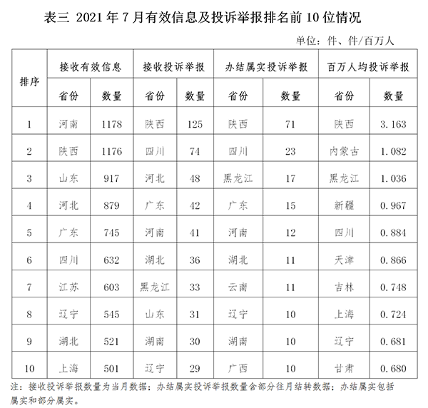 各省(自治區(qū)、直轄市)按照接收的有效信息數(shù)量排序,河南、陜西、山東、河北、廣東、四川、江蘇、遼寧、湖北、上海列全國前10位;按照接收的投訴舉報(bào)數(shù)量排序,陜西、四川、河北、廣東、河南、湖北、黑龍江、山東、湖南、遼寧排在全國前10位;按照辦結(jié)屬實(shí)的投訴舉報(bào)數(shù)量排序,陜西、四川、黑龍江、廣東、河南、湖北、云南、遼寧、湖南、廣西排在全國前10位;按照百萬人均投訴舉報(bào)數(shù)量排序,陜西、內(nèi)蒙古、黑龍江、新疆、四川、天津、吉林、上海、遼寧、甘肅排在全國前10位。(2021年7月有效信息及投訴舉報(bào)排名前10位情況見表三)