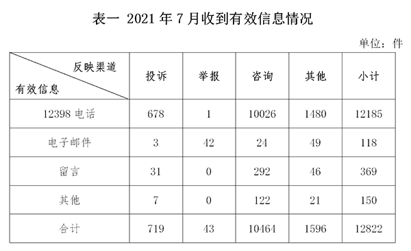 2021年7月,國家能源局12398能源監(jiān)管熱線(以下簡稱12398熱線)共收到有效信息12822件(包含投訴、舉報(bào)、咨詢和其他訴求類別),環(huán)比增加29.52%,同比增加11.58%。(2021年7月收到有效信息情況見表一)