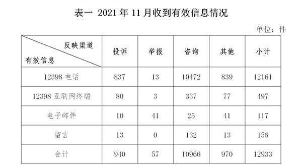 2021年11月,國(guó)家能源局12398能源監(jiān)管熱線(以下簡(jiǎn)稱12398熱線)共收到有效信息12933件(包含投訴、舉報(bào)、咨詢和其他訴求類別),環(huán)比增加21.81%,同比增加34.93%。(2021年11月收到有效信息情況見(jiàn)表一)