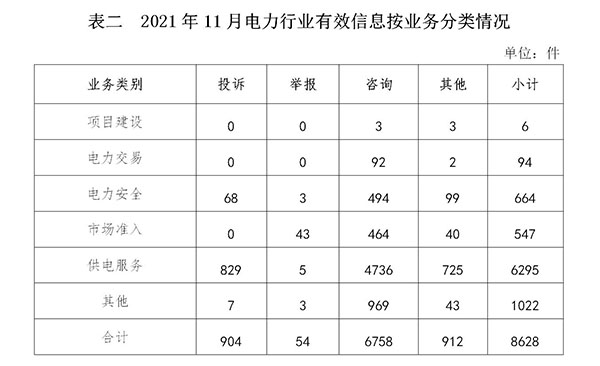 電力行業(yè)排在首位,有效信息數(shù)量為8628件,占全部有效信息的66.71%。群眾關(guān)注的內(nèi)容主要集中在故障停電、供電安全、電費(fèi)計(jì)量和收繳等方面。(2021年11月電力行業(yè)有效信息按業(yè)務(wù)分類情況見(jiàn)表二)