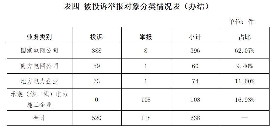 從被投訴舉報(bào)對象看,供電企業(yè)530件、占投訴舉報(bào)總數(shù)的83.07%,其中國家電網(wǎng)公司396件、占投訴舉報(bào)總數(shù)的62.07%,南方電網(wǎng)公司60件、占投訴舉報(bào)總數(shù)的9.40%,地方電力企業(yè)74件、占投訴舉報(bào)總數(shù)的11.60%;承裝(修、試)電力施工企業(yè)108件、占投訴舉報(bào)總數(shù)的16.93%。