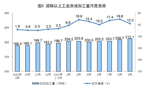 原油生產(chǎn)平穩(wěn)增長(zhǎng),進(jìn)口較快增長(zhǎng)。9月份,生產(chǎn)原油1687萬噸,同比增長(zhǎng)0.3%,增速比8月份放緩2.8個(gè)百分點(diǎn),日均產(chǎn)量56.2萬噸。進(jìn)口原油4574萬噸,同比增長(zhǎng)13.7%,增速比8月份回落17.2個(gè)百分點(diǎn)。